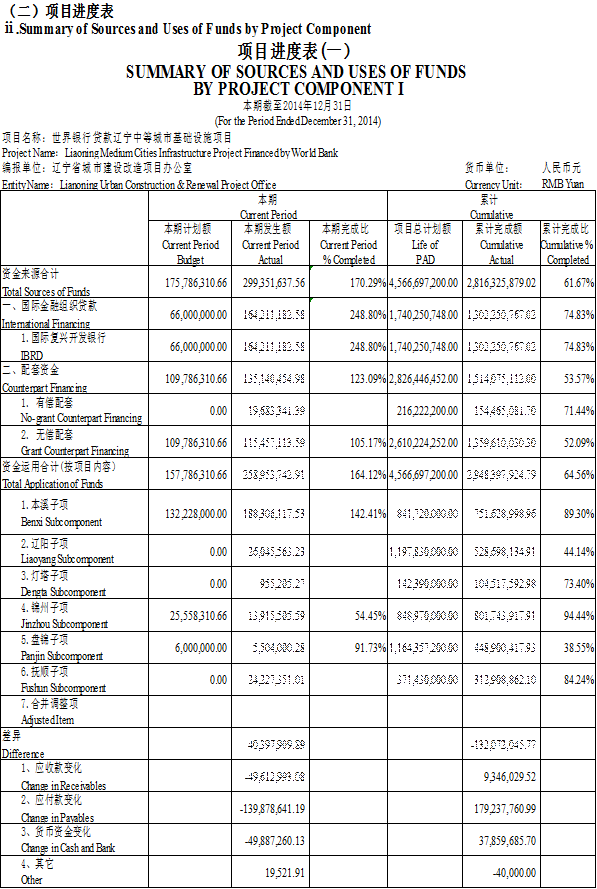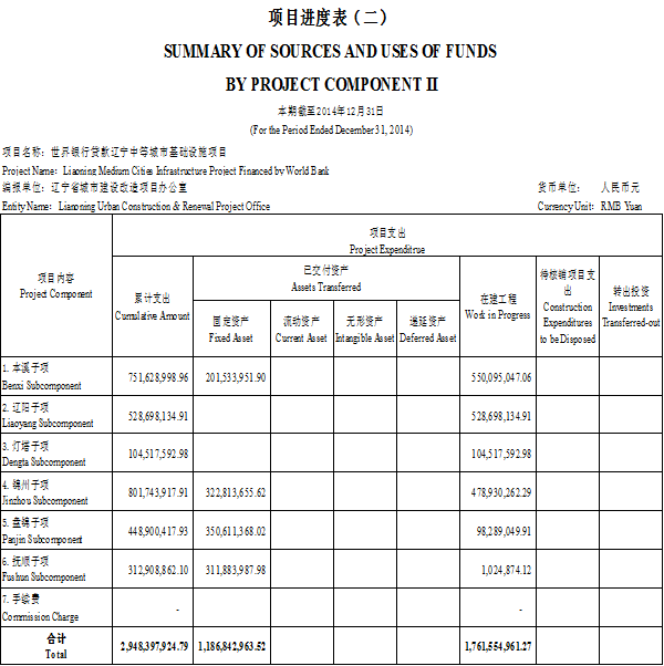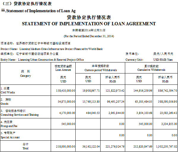 Due to the change of foreign exchange rate, there are discrepancies between the difference of the beginning and ending balance of the World Bank loan in the Balance Sheet, the current year’s loan received in the Summary of Sources and Uses of Funds by Project Component and the amount of current year’s withdrawals (disclosed in RMB) in the Statement of Implementation of Loan Agreement.