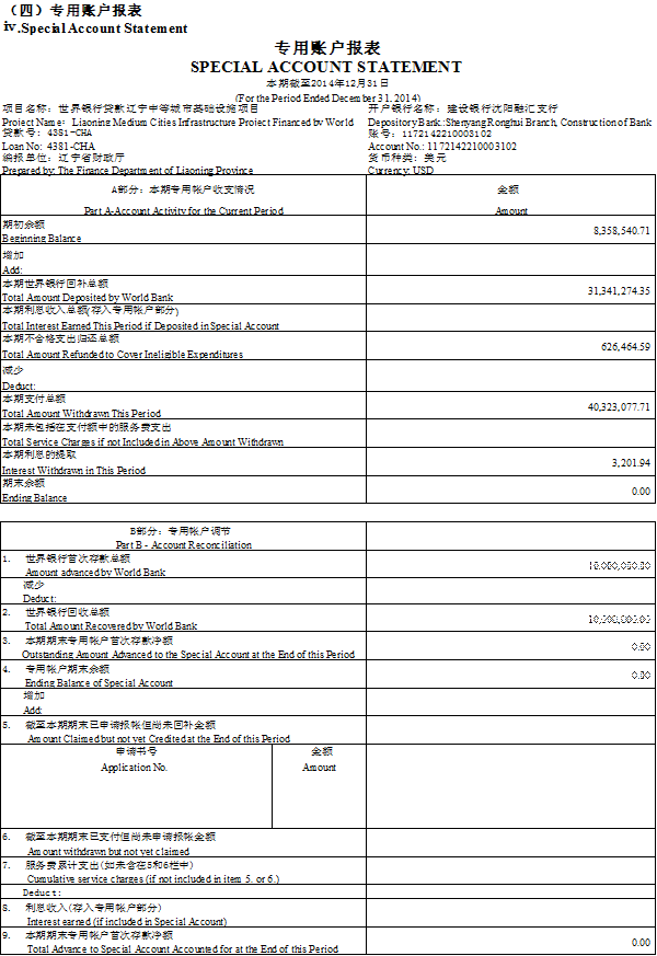 The Special Account of this project is set in Shenyang Ronghui branch, Construction of Bank with the account Number of 1172142210003102, and USD as currency unit. The initial Deposit of the Special Account is USD 10,000,000.00. The beginning balance of 2014 was USD 8,358,540.71. And the reimbursement in the year was USD 31,341,274.35. This year the interest earned was USD 0.00, total amount Refunded from Liaoyang subproject was USD 626,464.59, the disbursement was USD 40,323,077.71 and the service charges was USD 0.00. The interest withdrawn in this period was USD 3,201.94. Thus, the ending balance was USD 0.00.